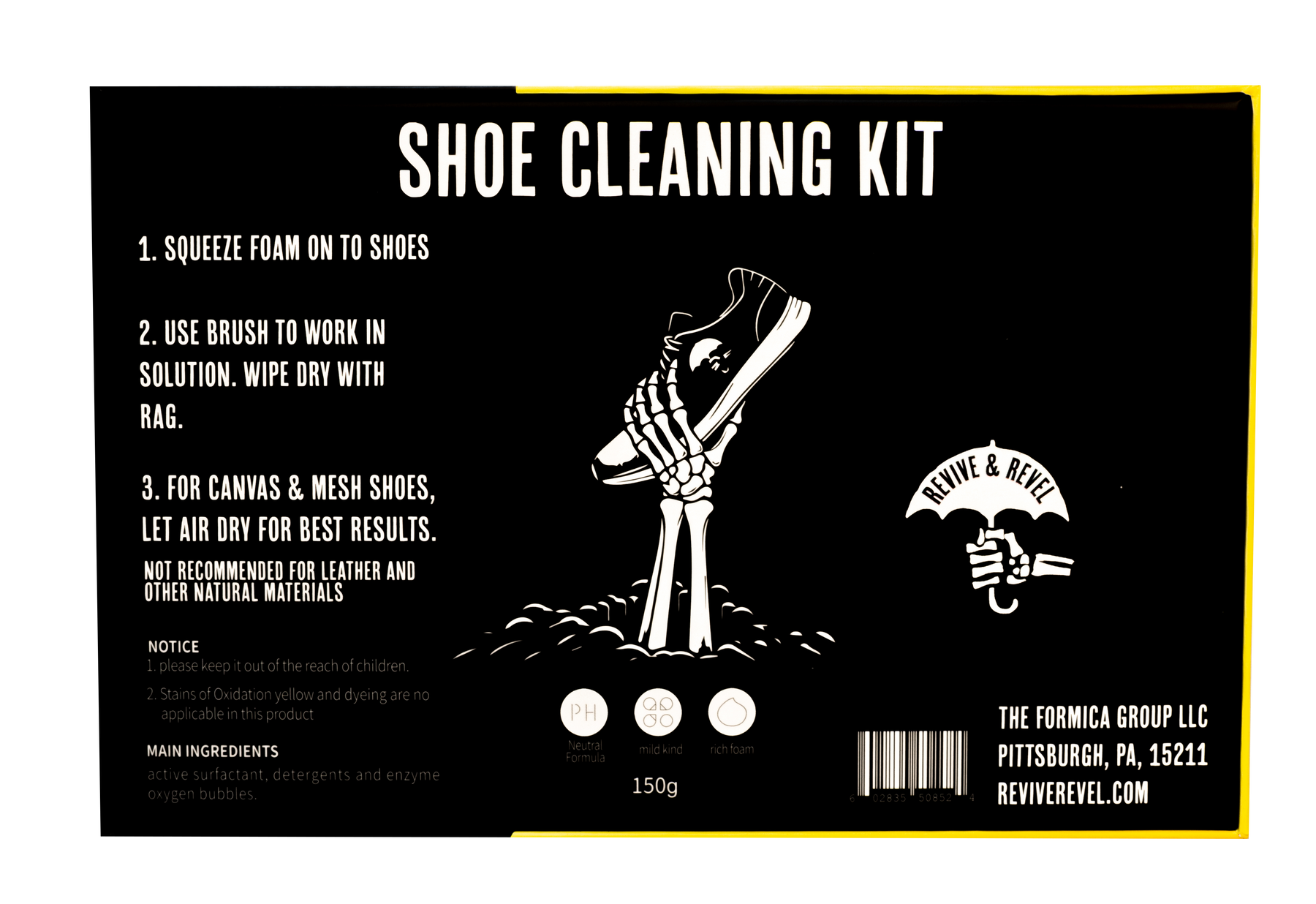 Revive & Revel Shoe Cleaning Kit includes foaming cleaning solution, brush, and microfiber cloth. For canvas and mesh shoes.