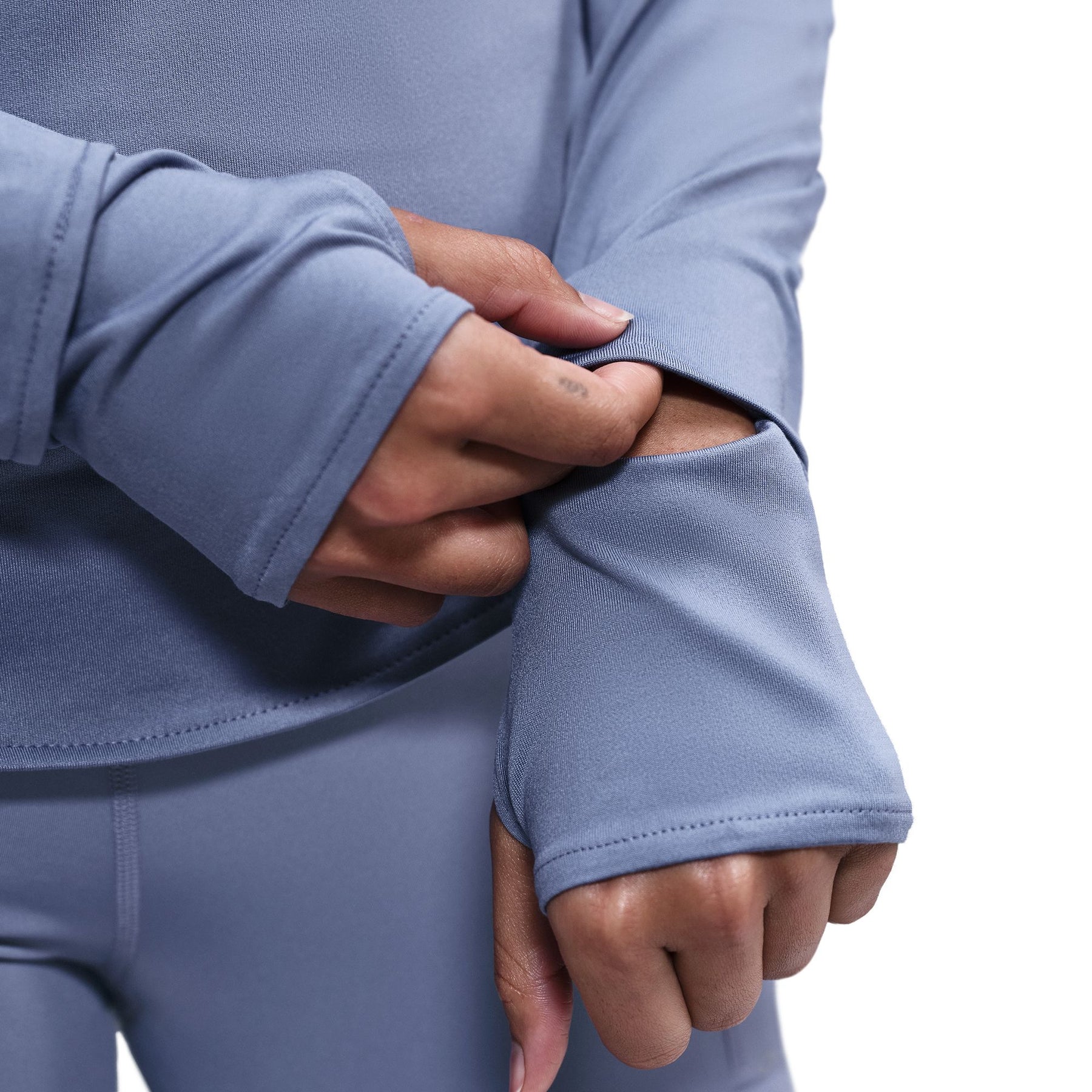 The top is tapered around the waist so that layering with other pieces is easier. A curved hem helps keep you covered through your stride. Plus, thumbholes let you extend your coverage and help hold the sleeves in place.